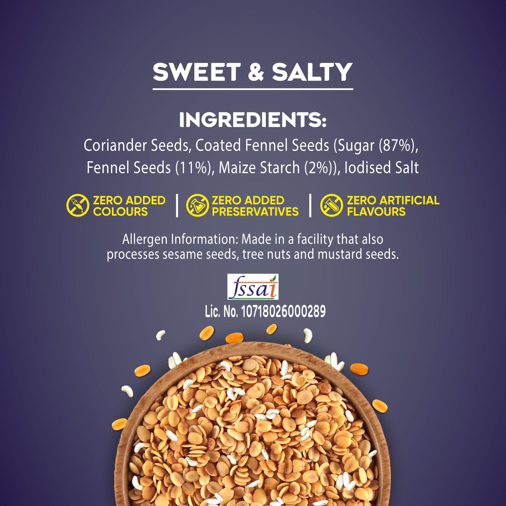 Classic Crunchy Roasted Split Coriander Seeds and Fennel Seeds as Sweet and Salty with Iodized Salt and turmeric blend.  Enjoy this as mouth freshener, food topper as well as quick snack to eat on to go. It is now in single serving convenient pack.